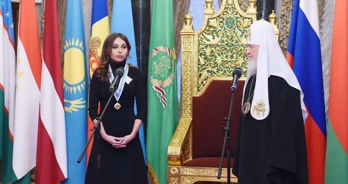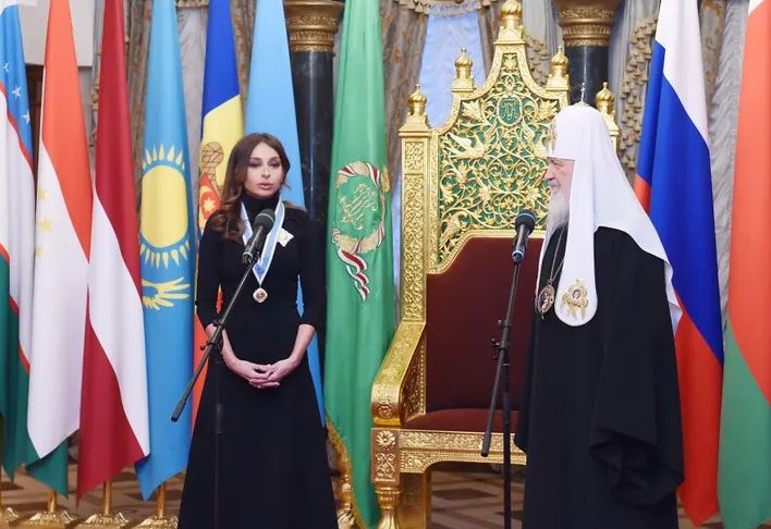 «Ադրբեջանի նախագահ Իլհամ Ալիևը մայիսի 3-ին հանդիպել է Բաքու ժամանած Մոսկվայի և Համայն Ռուսիո պատրիարք Կիրիլի հետ։ Հանդիպմանը մասնակցել է նաև Ադրբեջանի առաջին փոխնախագահ, երկրի առաջին տիկին և Հեյդար Ալիևի հիմնադրամի նախագահ Մեհրիբան Ալիևան։ Հանդիպումից հետո պատրիարքը Ադրբեջանի նախագահի կնոջը պարգևատրել է Ռուս Ուղղափառ եկեղեցու «Սուրբ հավասարառաքյալ Օլգայի»՝ Ռուս Ուղղափառ եկեղեցու 1-ին աստիճանի շքանշանով։ Ադրբեջանի առաջին տիկնոջը այս շքանշանը շնորհվել է Պատրիարք Կիրիլի հատուկ հրամանագրով՝ հասարակության մեջ ավանդական արժեքների պահպանմանը, ինչպես նաև մշակութային և կրոնական երկխոսության խթանմանը նպաստելու համար։