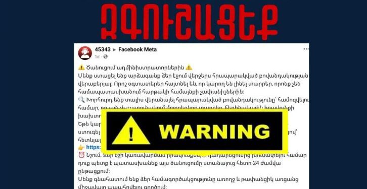 Եթե «Facebook» կամ «Instagram» սոցիալական ցանցերի ադմինիստրացիայի անունից ստացել եք ծանուցում ՝ Ձեր կողմից կայքի կանոնների խախտման, կամ Ձեր անհատական հաշվի վերաակտիվացման մասին, որով պահանջվում է ուղարկված հղումով տրամադրել Ձեր անհատական հաշվի մուտքանունն ու գաղտնաբառը՝ առաջացած խնդիրները լուծելու նպատակով, ՉՎՍՏԱՀԵՔ. հայտնում է ՆԳՆ ոստիկանությունը:
