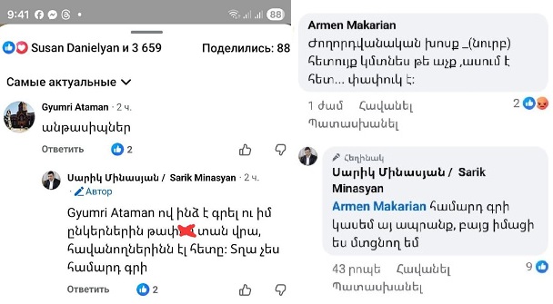 Համացանցում լայնորեն տարածվում է իշխանական թիմի ներկայացուցիչ Սարիկ Մինասյանի մասնակցությամբ սկանդալային հրապարակումը։ Ֆեյսբուքյան մեկնաբանություններում Մինասյանը, չզսպելով իրեն, անցել է էթիկայի բոլոր սահմանները և բացահայտ հայհոյանքներ ու սպառնալիքներ ուղղել օգտատերերից մեկին։