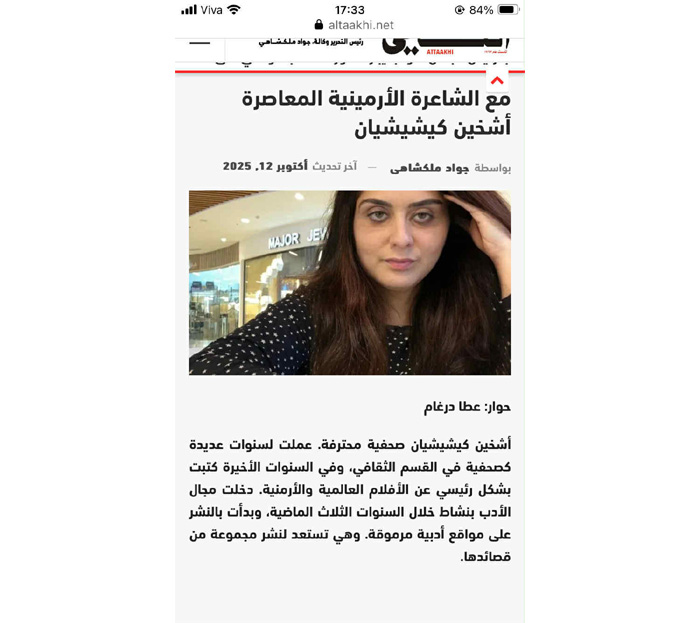 Իրաքում լույս տեսնող քրդական «Իրաքի եղբայրություն» արաբալեզու թերթում լրագրող Աթթա Դարգհամին տպագրել է 8 էջանոց հարցազրույց երեւանցի երիտասարդ լրագրող եւ բանաստեղծուհի Աշխեն Քեշիշյանի հետ՝ նաեւ արաբերեն թարգմանությամբ ներկայացնելով նրա «Ճանապարհները երբեմն իրենք սկսում են քայլել» եւ «Երբեմն հրեշտակն ընկնում է իմ ուսերից» բանաստեղծությունները: Դարգհամին Քեշիշյանի պոեզիային ծանոթացել է «Գրանիշ» առցանց գրական կայքէջում: Հարցազրույցում Քեշիշյանը պատմել է իր նախիների մասին, նշել, որ տատիկն արմատներով եղել է Ադանայից, խոսել ժամանակակից հայ պոեզիայի, իր գրական գործունեության մասին: