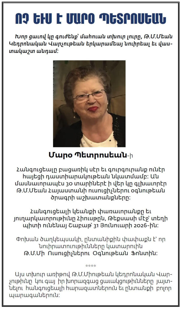 Խոր ցավով տեղեկացնում ենք, որ երկարատեւ հիվանդությունից հետո կյանքից հեռացել է Թեքեյան մշակութային միության երկարամյա ղեկավարներից Մարիամ (Մարո) Պետրոսյանը, Հյուստոնում (ԱՄՆ, Տեքսասի նահանգ) գտնվող իր բնակարանում, 84 տարեկան հասակում, շրջապատված իր ամուսնու՝ Սերոբ Պետրոսյանով, զավակներով ու թոռներով, կատարյալ խաղաղության մեջ: