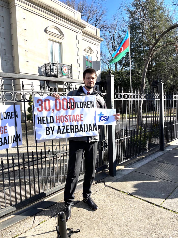 Ջոել Վելդքամփը բողոքում է Արցախի շրջափակման դեմ Վաշինգտոնում Ադրբեջանի դեսպանատան մոտ, 27 հունվարի, 2023: