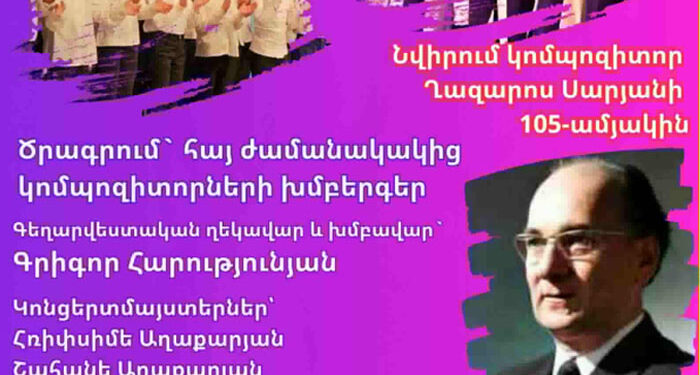 Համերգն իրականացվում է Հայաստանի Կոմպոզիտորների միության հետ համատեղ եւ նվիրված է տաղանդավոր կոմպոզիտոր Ղազարոս Սարյանի ծննդյան 105 ամյակին: