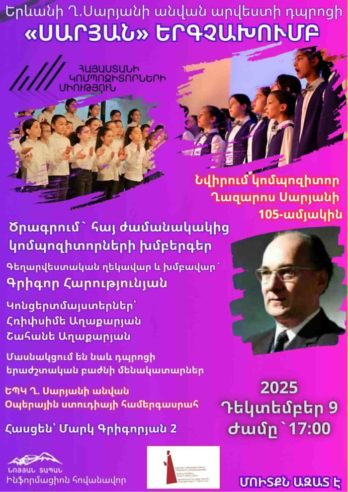Ս/թ դեկտեմբերի 9-ին, ժամը 17:00, Երեւանի Կոմիտասի անվան պետական Կոնսերվատորիայի Ղազարոս Սարյանի անվան օպերային ստուդիայի համերգասրահում տեղի կունենա Երեւանի Ղազարոս Սարյանի անվան արվեստի դպրոցի «Սարյան» երգչախմբի համերգը (գեղարվեստական ղեկավար եւ խմբավար՝ Գրիգոր Հարությունյան):