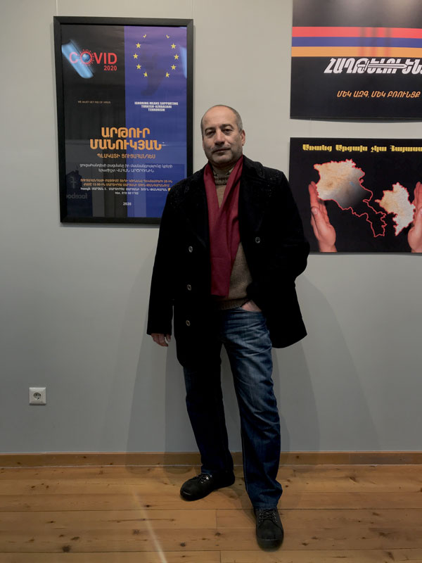 Թվում է, թե ցուցահանդեսի ո՛չ ժամանակն է, ո՛չ էլ հնարավոր է ստեղծագործելու սիրտ ունենալ, սակայն Արթուր Մանուկյանի «ԱՐՎԵՍՏԱԳԵՏԸ ԵՐԿՈՒ ԱՐՀԱՎԻՐՔՆԵՐԻ ԱՌԱՆՑՔՈՒՄ» խորագիրը կրող ցուցահանդեսը լավագույնս ապացուցում է, որ հնարավոր է, այն էլՙ ամեն օրվա իրադարձություններին զուգահեռ, անմիջապես արձագանքելով դրանց: Մեր իրականության երկու արհավիրքներըՙ պատերազմ եւ համավարակ, նկարչի պրպտուն, սրտացավ հայացքի ներքո վավերացնում են ժամանակըՙ պլակատի արվեստի լեզվով: Դիզայներ, նկարիչ Արթուր Մանուկյանի արվեստը մի քանի ճյուղ ունիՙ հարթաքանդակ, գրաֆիկա, պլակատի արվեստ եւ դիզայն (թանգարանների, հեռուստատաղավարների եւ այլն):