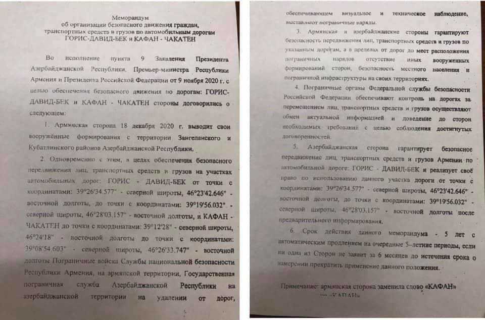 Հայաստանի, Ադրբեջանի և Ռուսաստանի դաշնության միջև ստորագրված հուշագրի նույնիսկ տեքստը հրապարակվեց և շրջանառվեց համացանցում, սակայն ՀՀ ԱԳ նախարարը հայտարարեց, որ տեղյակ չէ այդ հուշագրից, իսկ վարչապետը առ այս պահը չի արձագանքել դրան։