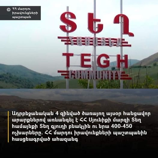 ՀՀ մարդու իրավունքների պաշտպանին հասցեագրվել է ահազանգ այն մասին, որ ադրբեջանական 4 զինված ծառայող այսօր հանցավոր արարքներով առևանգել է ՀՀ Սյունիքի մարզի Տեղ համայնքի Տեղ գյուղի բնակչին ու նրա ոչխարներըԸստ ահազանգի տվյալների՝ ՀՀ բնակիչը Տեղ համայնքի Տեղ, Արավուս և Խնածախ գյուղերի հատման հատվածում գտնվող արոտավայրում արածեցրել է իր ոչխարներին: