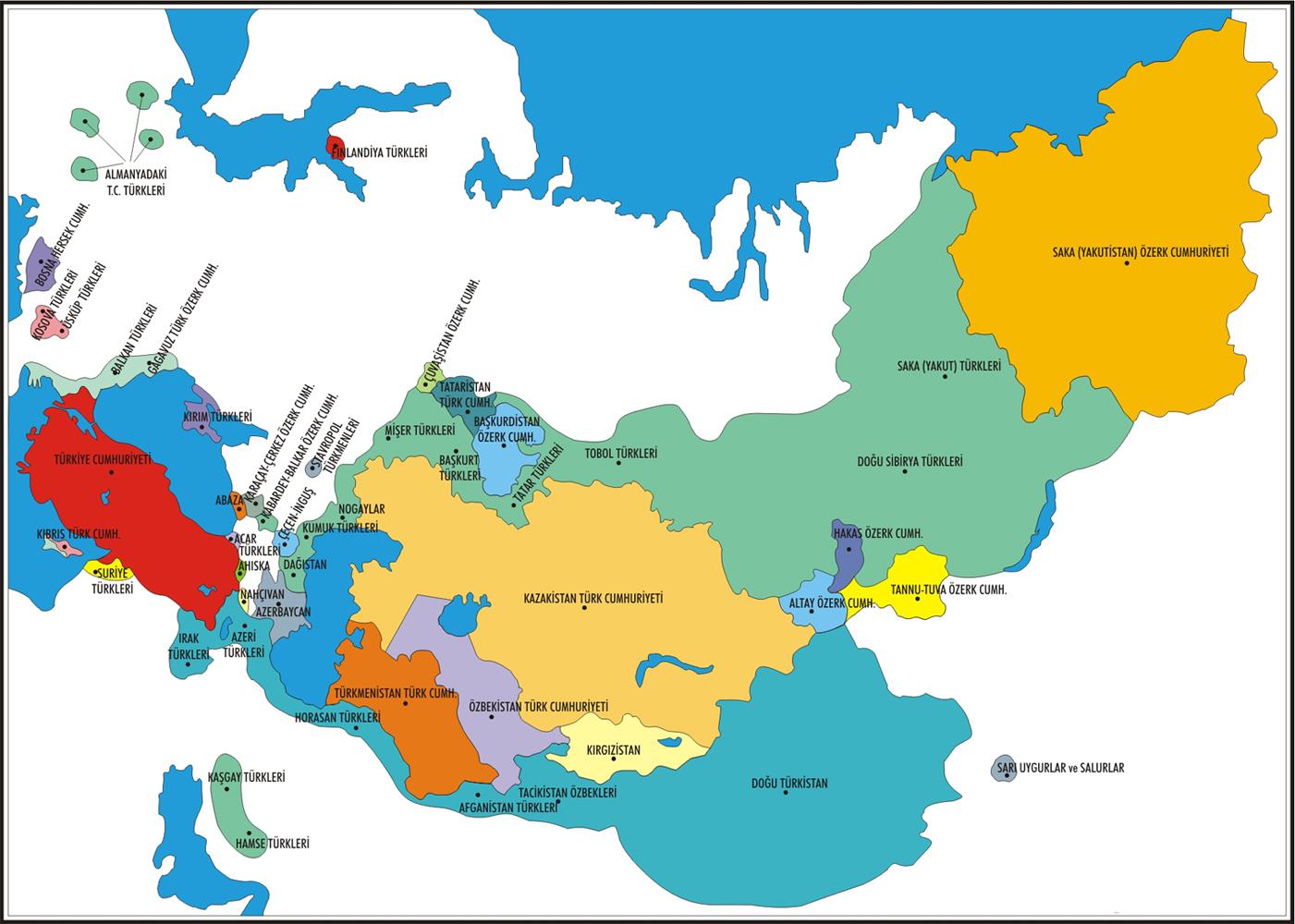 Քարտեզում՝ թյուրքական աշխարհը ըստ Թուրքիայում տարածված պատկերացման, որը կիսում են բոլորը՝ սովորական մարդկանցից մինչև քաղաքական վերնախավի ճնշող մեծամասնությունը։
