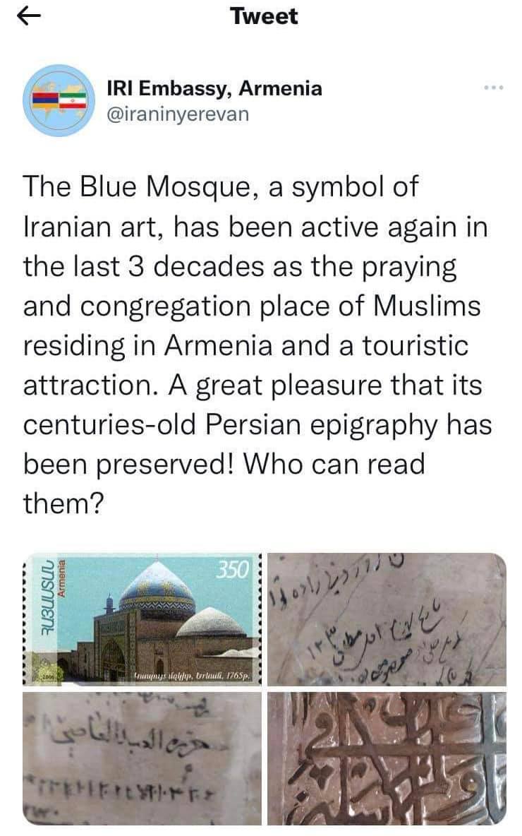 Գրառումից կարճ ժամանակ անց ՀՀ-ում Իրանի դեսպանատունը թվիթերյան էջում դիվանագիտական նուրբ պատասխան է տվել ադրբեջանցի պատգամավորներին. «Իրանական արվեստի խորհրդանիշ հանդիսացող Կապույտ մզկիթը շատ ակտիվ դերակատարում է ունեցել վերջին երեք տասնամյակների ընթացքում որպես աղոթատեղի և հավաքատեղի Հայաստանում ապրող մահմեդականների համար, ինչպես նաև ունեցել է զբոսաշրջային գրավչություն: Շատ հաճելի է, որ դարավոր գրվածքները պահպանվել են: Կարո՞ղ եք դրանք կարդալ»: