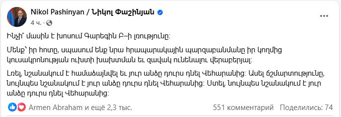 Փաշինյանը շարունակում է կաթողիկոսահալած վարքագիծը։ Նոր գրառում է արել.