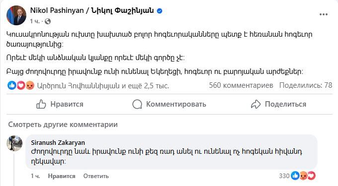 Հիշեցնենք, որ հոգևոր դասի ներկայացուցիչները երեկվանից պարբերաբար արձագանքում են Փաշինյանի պոպուլիստական, գռեհիկ բառապաշարով հայտարարություններին ու հայհոյանքներին։