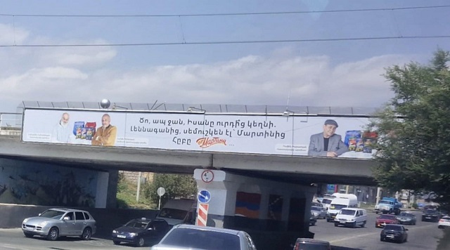 Գյումրիի կենտրոն տանող ճանապարհին գտնվող երկաթուղային կամուրջի վրա տեղադրված գովազդային այս պաստառի վրա վաստակավոր դերասան-գործիչները գովազդում են հայտնի բրենդային շեմուշկեն (հայերեն՝ արևածաղկի սերմը):
