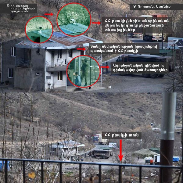 Սյունիք վերջին այցի ընթացքում դրանում համոզվել եմ ինքս տեղում, երբ մեր աշխատակազմով այս տանն էինք և ինքներս տեսանք, որ ադրբեջանական զինված ծառայողները մեզ տեսնելուն պես տեսախցիկներից մեկն անմիջապես ուղղեցին դեպի մեզ: