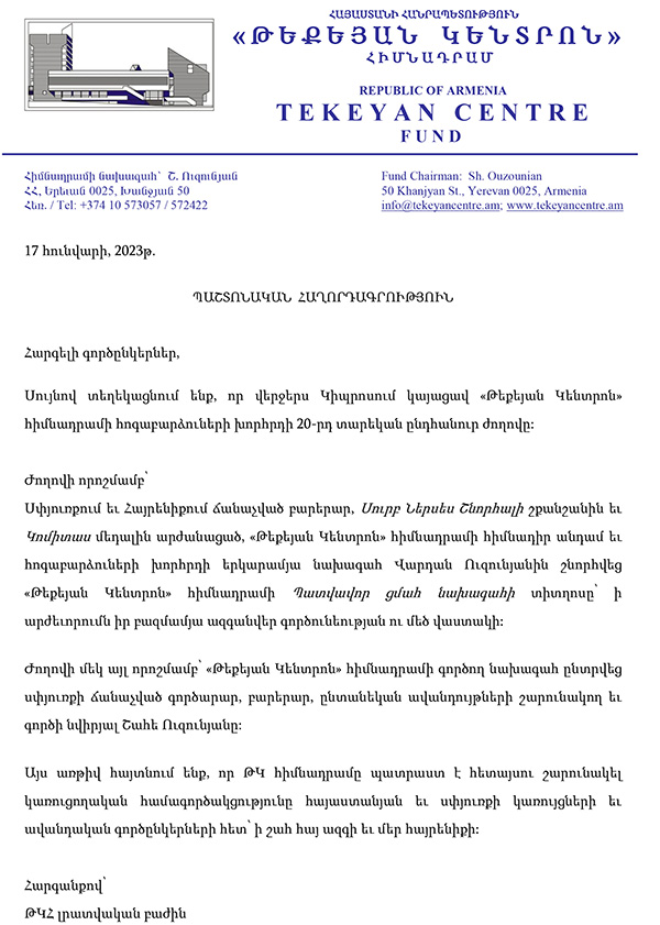 «ԱԶԳ»ի խմբագրությունը շնորհավորում եւ բեղմնավոր գործունեություն է մաղթում Հիմնադրամի նորընտիր նախագահ Շահե Ուզունյանին