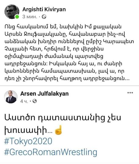 Ավելի վաղ Ջուլֆալակյանը գրել էր` «Աստծո դատաստանից չես խուսափի» և ավելացրել #Tokyo2020 #GrecoRomanWrestling հեշթեգերը: