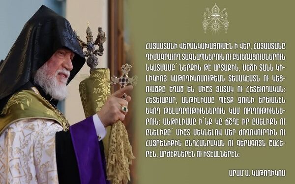Հայաստանի վերանկախացումէն ի վեր, Հայաստանը դիմագրաւող տագնապներուն ու բեւեռացումներուն նկատմամբ՝ ներքին թէ արտաքին, Մեծի Տանն Կիլիկիոյ Կաթողիկոսութեան տեսակէստն ու կեցուածքը եղած են միշտ յստակ ու հետեւողական։