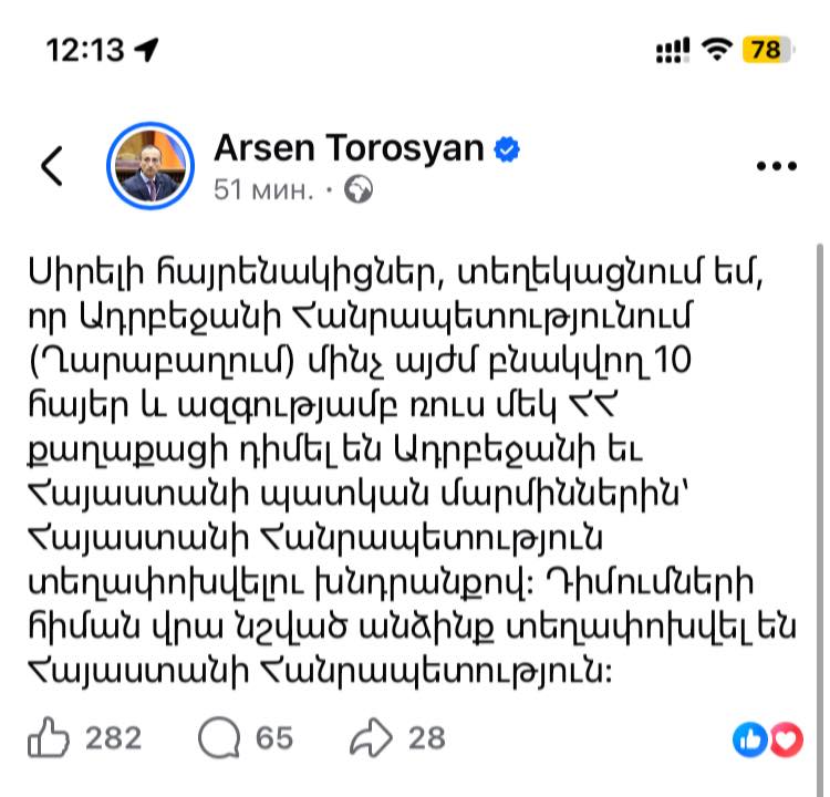 Հետո եղավ 2020-ը, դրանից հետո 2023-ը, ու ամեն ինչ փոխվեց մեր կյանքում։ Փոխվեցին նաև Թորոսյան Արսենի պատկերացումները Արցախի հայկականության մասին, իսկ վերադասին հաճոյանալու անհեթեթ ջանքերը նրան բերեցին այնպիսի ինքնաուրացման մի մակարդակի, որ այսօր, խոսելով Արցախից Հայաստան վերադարձված 10 հայերի մասին, Թորոսյանը որոշել է Ղարաբաղի տեղը ավելի հստակ բացատրել ու անպայման նշել, որ Ղարաբաղը գտնվում է Ադրբեջանի Հանրապետությունում։