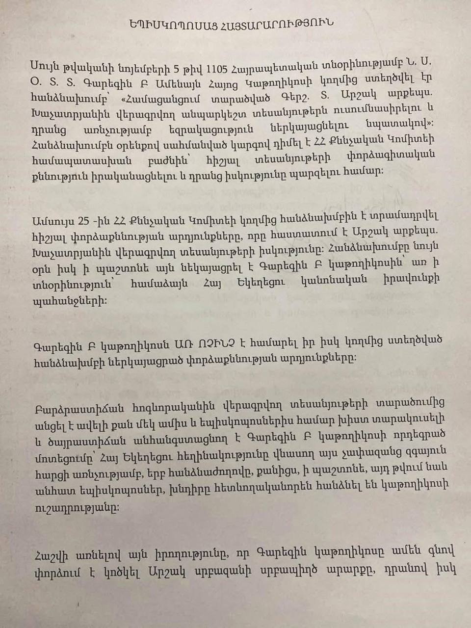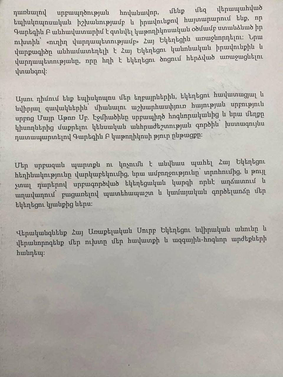 Հաշվի առնելով այն իրողությունը, որ Գարեգին կաթողիկոսը ամեն գնով փորձում է կոծկել Արշակ սրբազանի սրբապիղծ արարքը, դրանով իսկ դառնալով սրբապղծության հովանավոր, մենք մեզ վերապահած իշխանությամբ և իրավունքով հայտարաում ենք, որ Գարեգին Բ անհավատարիմ է գտնվել կաթողիկոսական օծմամբ ստեղծված իր ուխտին։