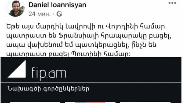 Նշենք, որ Ագնեսա Խամոյանը պատասխանել է «Իրազեկ քաղաքացիների միավորում» հկ նախագահ Դանիել Իոաննիսյանին, որը գրել էր. «Եթե այս մարդիկ Լավրովի և Վոլոդինի համար պատրաստ են Ֆրանսիայի հրապարակը բացել, ապա վախենում եմ պատկերացնել, թե ինչն են պատրաստ բացելՊուտինի համար»։