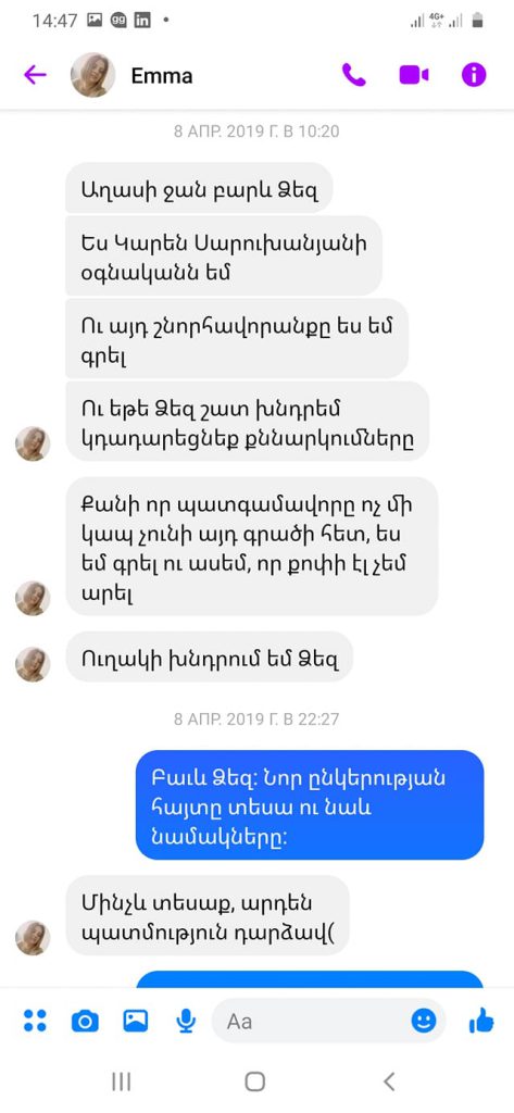«Էս աղջիկն էսօր դեպուտատ դարձավ։ Հիշեցնեմ. Շիրակի նախկին մարզպետ, հետո դեպուտատ Կարեն Սարուխանյանի օգնականն էր, ով Արմեն Աշոտյանի նախորդ տարիների շնորհավորանքը քոփի փաստ էր արել ու սղացրել մարզպետի անվան տակ։ Ես գրել էի էդ մասին։ Խնդրում էր, որ գրառումս ջնջեմ։ Մերսի քեզ, Փաշինյան Նիկոլ»։