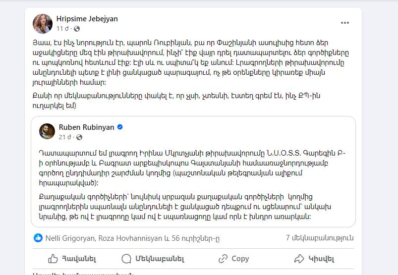 «Դատապարտում եմ լրագրող Իրինա Մկրտչյանի թիրախավորումը Ն.Ս.Օ.Տ.Տ. Գարեգին Բ-ի օրհնությամբ և Բագրատ արքեպիսկոպոս Գալստանյանի համաառաջնորդությամբ գործող ընդդիմադիր շարժման կողմից (պաշտոնական թելեգրամյան ալիքում հրապարակված): Քաղաքական գործիչների` նույնիսկ սրբազան քաղաքական գործիչների կողմից լրագրողներին սպառնալն անընդունելի է ցանկացած դեպքում ու սցենարում` անկախ նրանից, թե ով է լրագրողը կամ ով է սպառնացողը կամ որն է խնդրո առարկան»,- այս գրառումը Ֆեյսբուքում քիչ առաջ արել է ԱԺ փոխնախագահ Ռուբեն Ռուբինյանը։