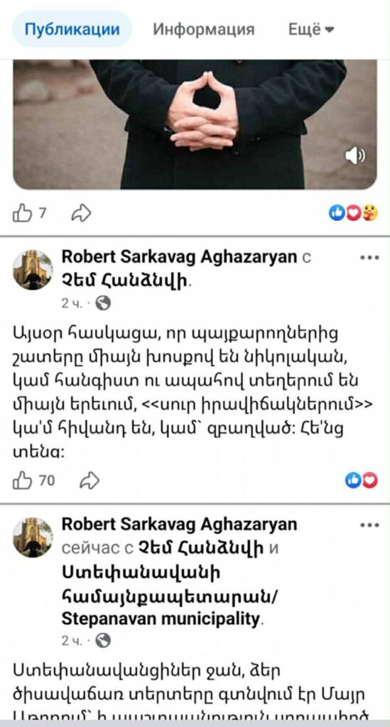 Նրանցից մեկը` կարգալույծ եղած նիկոլական սարկավագ Ռոբերտ Աղազարյանը անգամ ՖԲ իր էջում նիկոլականներին կշտամբող գրառում է առել ու երկու ժամ անց ջնջել գրածը, հավանաբար՝ վերևների հրահանգով․