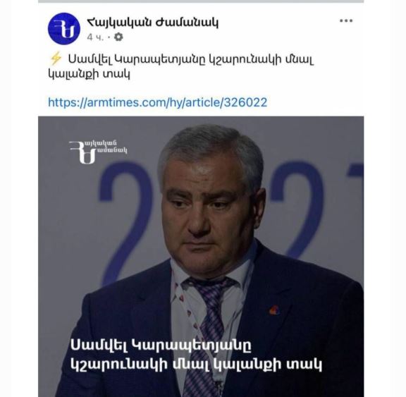 Նշենք, որ մինչ ընթանում էր կալանքի միջնորդության քննությունը, իշխանական լրատվամիջոց «Հայկական ժամանակն» արդեն հրապարակել էր «վերդիկտը», թե Սամվել Կարապետյանը կշարունակի մնալ կալանքի տակ։ Այսինքն՝ իշխանական խմբագրությունում նախապես որոշվել էր, որ Սամվել Կարապետյանի կալանաքն անպայման երկարացվելու է, ու Հակակոռուպցիոն դատարանն այն իսկապես երկարացեց 2 ամսով։