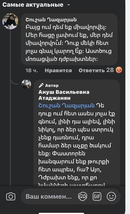 Հանրային ռադիոյի տնօրեն Արմեն Քոլոյանի կինը՝ Շուշան Ղազարյանը, ֆեյսբուքյան էջի մեկնաբանությունների բաժնում վիրավորական արտահայտություններ է գրել արցախցիների հասցեին։ Նա գրել է. «Բայց ում դեմ եք միավորվել։ Մեր հացը լափում եք, մեր դեմ միավորվո՞ւմ։ Դուք մեկի հետ յոլա գնալ կարող ե՞ք։ Աստծուց մերժված դժբախտներ»։
