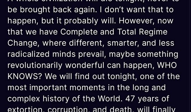 «Ես չեմ ուզում, որ դա պատահի, բայց հավանաբար կպատահի։ Այնուամենայնիվ, հիմա, երբ մենք ունենք ռեժիմի ամբողջական և լիակատար փոփոխություն, որտեղ գերակշռում են այլ, ավելի խելացի և պակաս ռադիկալացված մտքերը, գուցե ինչ-որ հեղափոխական հրաշալի բան պատահի, ով գիտի։ Մենք դա կպարզենք այս գիշեր՝ աշխարհի երկար ու բարդ պատմության ամենակարևոր պահերից մեկում։ 47 տարվա շորթումը, կոռուպցիան և մահը վերջապես կավարտվեն։ Աստված օրհնի Իրանի մեծ ժողովրդին»,-ասել է Թրամփը։