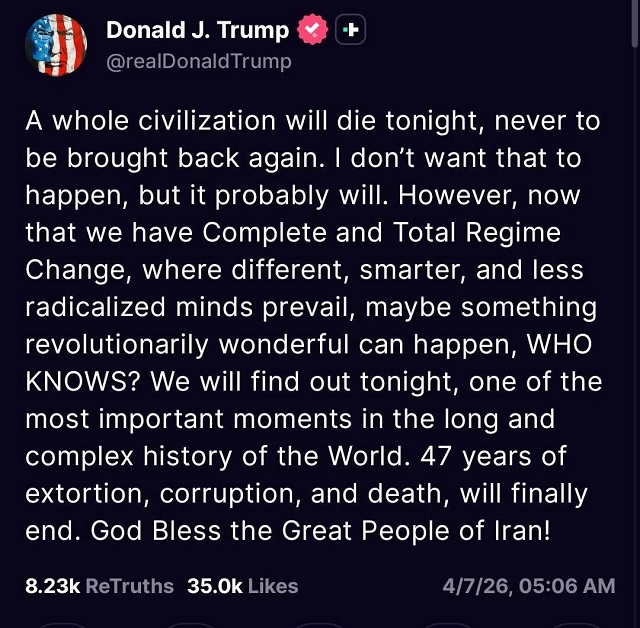 Թրամփը հայտարարել է, որ «մի ամբողջ քաղաքակրթություն կմեռնի այս գիշեր»։