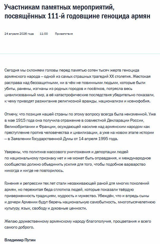 Նշեմ, որ մեր երկրի դիրքորոշումն այս հարցում միշտ եղել է անփոփոխ։ Դեռևս 1915 թվականի մայիսին այն արտացոլվել է Ռուսաստանի, Մեծ Բրիտանիայի և Ֆրանսիայի համատեղ հռչակագրում, որով հայ ժողովրդի նկատմամբ բռնությունը դատապարտվել է որպես հանցագործություն մարդկության և քաղաքակրթության դեմ, իսկ արդեն պատմության նոր փուլում՝ 1995 թվականի ապրիլի 14-ի Պետդումայի հայտարարության մեջ»,- ասված է Պուտինի ուղերձում։