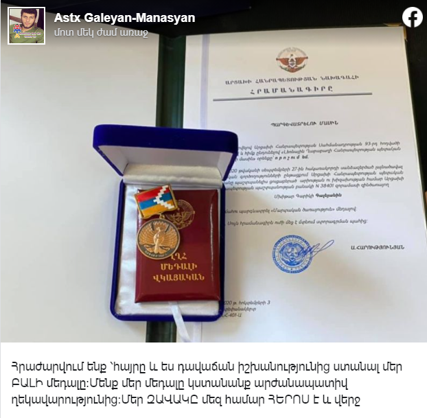 Արցախում 44-օրյա պատերազմի ժամանակ զոհված Մխիթար Գալեյանի ծնողները հրաժարվում են Արայիկ Հարությունյանի շնորհած «Մարտական ծառայություն» մեդալից։ Այս մասին ֆեյսբուքյան իր էջում գրել է Մխիթարի մայրը՝ Աստղիկ Գալեյանը։ «Հրաժարվում ենք դավաճան իշխանությունից ստանալ իմ ԲԱԼԻՍ մեդալը։ Մենք մեր մեդալը կստանանք արժանապատիվ ղեկավարությունից։ Իմ ԶԱՎԱԿՍ մեր համար ՀԵՐՈՍ է և վերջ»։