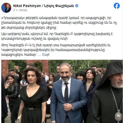 Փաշինյանի կաթողիկոսահալած հերթական գրառումը՝