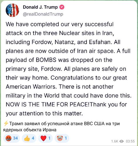 «Մենք ավարտել ենք մեր շատ հաջող հարձակումը Իրանի երեք միջուկային օբյեկտների վրա, ներառյալ Ֆորդոուն, Նաթանզը և Սպահանը։ Բոլոր ինքնաթիռներն այժմ Իրանի օդային տարածքից դուրս են։ Ռումբերի ամբողջական բեռն արձակվել է հիմնական օբյեկտի՝ Ֆորդոուի վրա։ Բոլոր ինքնաթիռներն ապահով վերադառնում են իրենց տուն։ Շնորհավորում ենք մեր մեծ ամերիկացի մարտիկներին։ Աշխարհում ոչ մի այլ բանակ չէր կարող դա անել։ Հիմա ԽԱՂԱՂՈՒԹՅԱՆ ժամանակն է։ Շնորհակալություն այս հարցին Ձեր ուշադրության համար», – ասել է Թրամփը: