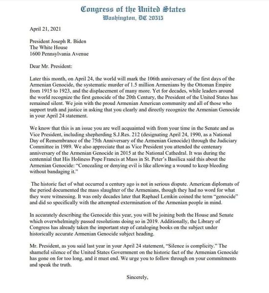 «Մի խումբ կոնգրեսականներ դիմել են ԱՄՆ նախագահ Ջո Բայդենին՝ կոչ անելով հավատարիմ լինել սեփական հայտարարություններին եւ ճանաչել Հայոց ցեղասպանությումը։