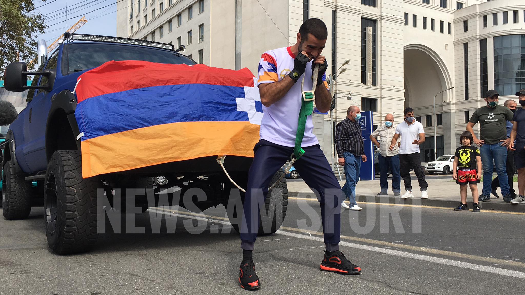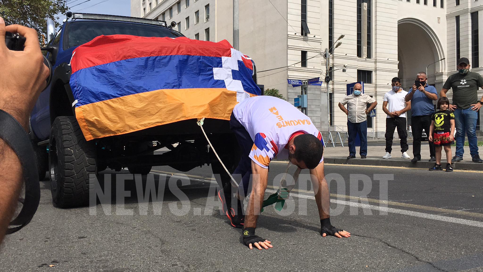 «Շնորհավորում եմ բոլորիս Հայաստանի անկախության տոնի առթիվ: Մենք եղբայրներով որոշել ենք Հայաստանի եւ Արցախի պատմության մեջ առաջին անգամ սահմանել համաշխարհային ռեկորդներ, որոնք կգրանցվեն Գինեսի գրքում, այդ թվում եւ համաշխարհային մի շարք ասոցիացիաներում: Այս ռեկորդները նվիրում ենք Հայաստանի անկախության 29-րդ տարեդարձին: Ես սահմանելու են նմանը չունեցող ռեկորդ՝ ձեռքերի վրա կանգնած ատամներով քաշելու եմ 4 տոննա ավտոմեքենա: Այս ռեկորդն առաջին անգամ արել է ադրբեջանցի մարզիկ 7 տարի առաջ: Նա այդ ժամանակ ատամներով տեղաշարժել է 2 տոննա ավտոմեքենա: Ես այս պահին 4 տոննա քաշ ունեցող ջիպ ավտոմեքենա եմ տեղաշարժելու ձեռքի վրա քայլելով եւ ճոպանն ատամներիս վրա դրված: մեկ մետրից ավել եթե անցնեմ, ռեկորդը սահմանված կլինի»,-ասել է Յուրի Սաքունցը: