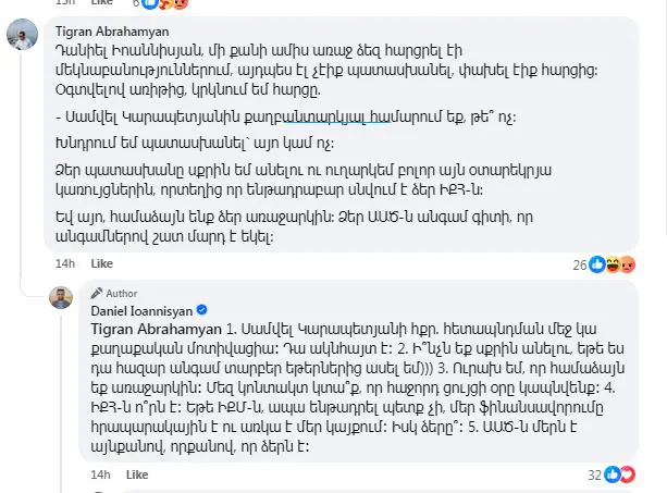 Ֆեյսբուքյան իր գրառման ներքո ծավալված քննարկման ժամանակ օգտատերերից մեկը հարցրել է, «Սամվել Կարապետյանին քաղբանտարկյալ համարում եք, թե՞ ոչ: Խնդրում եմ պատասխանել` այո կամ ոչ»։