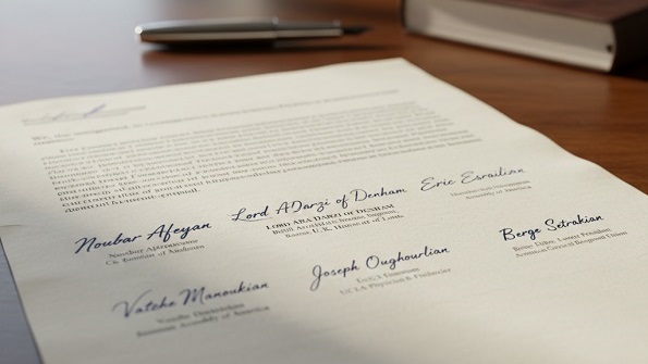 Նամակը ստորագրուած է Նուպար Աֆէեանին՝ Moderna-ի համահիմնադիր, Անթոնի Պարսամեանին՝ Ամերիկայի Հայկական Համագումարի նախկին նախագահ, Տէնհըմի լորտ Արա Տարզիին՝ բրիտանահայ վիրաբոյժ եւ Մեծ Բրիտանիոյ Լորտերու Պալատի անդամ, Էրիք Էսրայէլեանին՝ UCLA-ի բժիշկ եւ բարերար, Վաչէ Մանուկեան գործարարին, Ժոզէֆ Ուղուրլեան ֆրանսացի դրամատէրին եւ Պերճ Սեդրակեանին՝ Հայ Բարեգործական Ընդհանուր Միութեան Պատուոյ նախագահ։