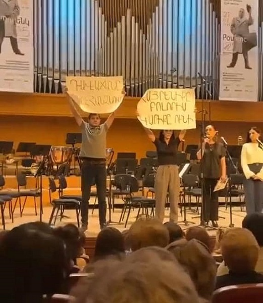 «Հայրենիքը բոլորիս կարիքն ունի», «Դավաճանը հող է հանձնում» պաստառները բարձր բռնած՝ երիտասարդները այս երեկո «Արամ Խաչատրյան» համերգասրահի բեմ են բարձրացել։
