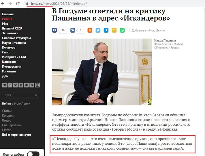 Պետդումայի պաշտպանության կոմիտեի նախագահի տեղակալ Վիկտոր Զավարզինը մեղադրել է Հայաստանի վարչապետ Նիկոլ Փաշինյանին ստախոսության մեջ `«Իսկանդերի» անարդյունավետության մասին հայտարարությունից հետո: