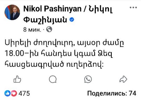 «Սիրելի ժողովուրդ, այսօր ժամը 18․00–ին հանդես կգամ Ձեզ հասցեագրված ուղերձով», – գրել է նա: