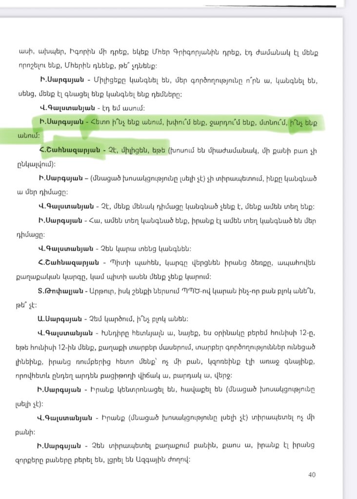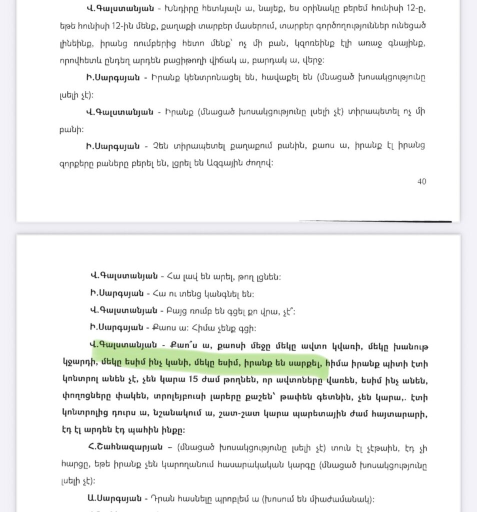 Կից նկարներում քննչական կոմիտեի տարածած ձայնագրությունների հաջորդական հատվածներ ու գլխավոր դատախազի` ԱԺ ներկայացրած հրապարակային միջնորդագրից հատվածները: