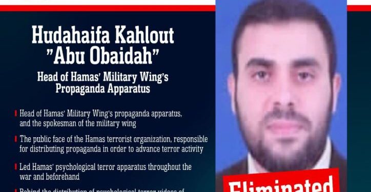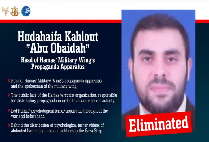 Իսրայելի պաշտպանության ուժերը (IDF) հաստատել են ՀԱՄԱՍ-ի ռազմական թևի խոսնակ Աբու Ուբեյդայի (Խուդախայֆա Քահլութ) սպանությունը. տեղեկատվությունը տարածվել է IDF Telegram ալիքով։