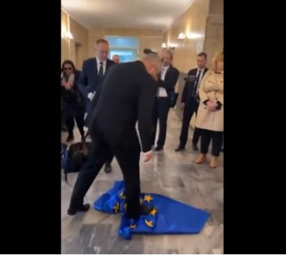 Քաղաքական գործիչը տարածել է տեսանյութ, որտեղ երևում է, թե ինչպես է նա մտնում Կատովիցեում գտնվող Լեհաստանի արդյունաբերության նախարարության շենք և հանում ԵՄ դրոշը գերատեսչության նախասրահում գտնվող ձողից։