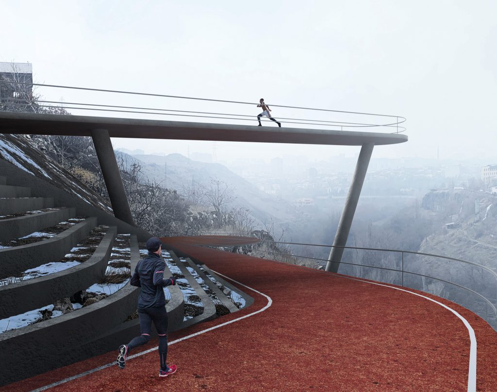 «Գլխավոր հատակագծում նախատեսված էր վազքուղի՝ շեշտադրված կարմիր նյութով, որը կհավաքեր միջավայրը կառույցի շուրջ։ Վազքուղու և կառույցի միջև կար հարթակ, որը կարող էր ծառայել տարատեսակ միջոցառումների համար։ Սպորտային կոմպլեքսին տվել էինք պարզ, մաքուր կուբի ծավալային տեսք։ Մուտքային հանգույցը նախագծված է որպես ակցենտ՝ շեշտելով ուղղությունը։ Նախատեսում էինք կառույցը իրականացնել մետաղական կոնստրուկցիաներով, ֆորմաներով։