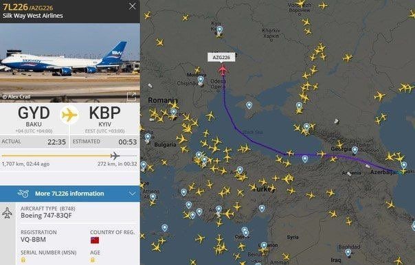 Ապրիլի 7-ին ադրբեջանական Boeing 747-83QF բեռնատար ինքնաթիռը Բաքվից ուղևորվել է Կիև։ Նշենք, որ Silk Way West Airlines–ին պատկանող Boeing 747-83QF ինքնաթիռը Արցախյան 44-օրյա պատերազմի ժամանակ բազմիցս զենք է տեղափոխել Ադրբեջան, ներառյալ՝ Ուկրաինայից։