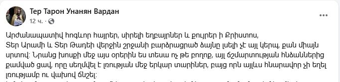 Եվ դու՞, Բրուտոս. Տե՛ր Տարոն քահանա Հունանյան, քեզ ի՞նչ պատահեց։ Հատո՞ւկ էիր ընտրել երեկվա օրը, թե՞ ավելի գոտեպնդվեցիր, երբ Եկեղեցու ավագ սերնդին դատապարտեցին ազատազրկման։