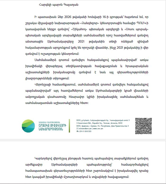 Ի պատասխան ՇՄՆ-ն ասում է, որ «…«Շիկահող» պետական արգելոցի և «Սոսու պուրակ» պետական արգելավայրի տարածքների սահմանամերձ որոշ հատվածներում գտնվող ͟ա͟ն͟տ͟ա͟ռ͟ա͟յ͟ի͟ն͟ ͟է͟կ͟ո͟հ͟ա͟մ͟ա͟կ͟ա͟ր͟գ͟ե͟ր͟ը͟ 2021 թ տեղի ունեցած ͟զ͟ի͟ն͟վ͟ա͟ծ͟ ͟հ͟ա͟կ͟ա͟մ͟ա͟ր͟տ͟ո͟ւ͟թ͟յ͟ա͟ն͟ ͟ա͟ր͟դ͟յ͟ո͟ւ͟ն͟ք͟ո͟ւ͟մ͟ ͟կ͟ր͟ե͟լ͟ ͟ե͟ն͟ ͟ո͟ր͟ո͟շ͟ա͟կ͟ի͟ ͟վ͟ն͟ա͟ս͟ն͟ե͟ր͟…»:
