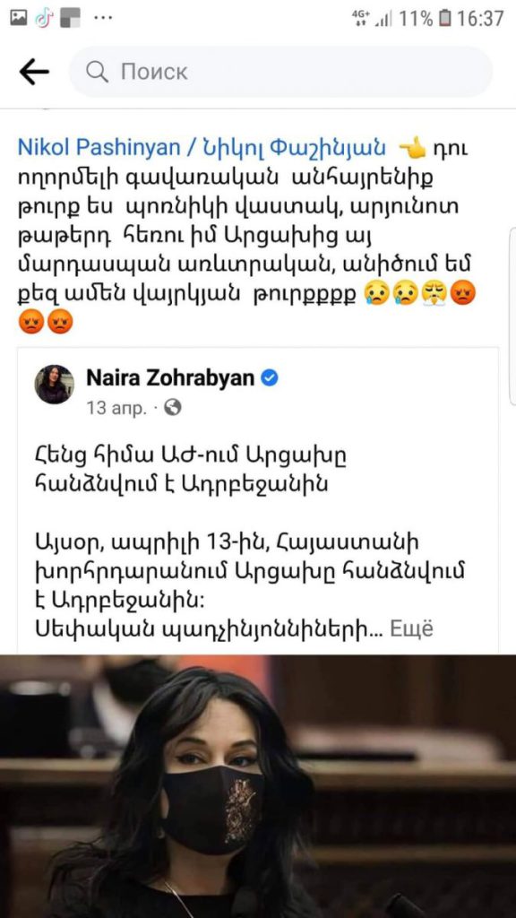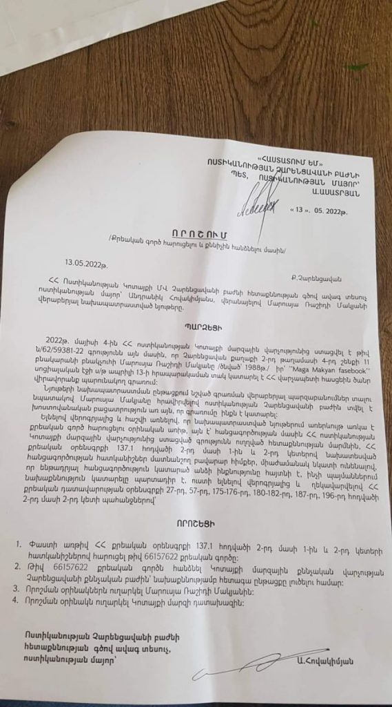Իրազեկում եմ հանրությանը, որ ահա այս՝ խիստ քննադատական գրառման համար իմ նոր հիանալի վստահորդ Մագա Մակյանի նկատմամբ հարուցվել է քրեական գործ «ծանր վիրավորանքի» հոդվածով։