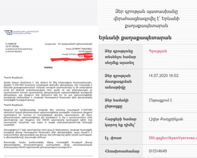 Հանրային գործիչ Արթուր Չախոյանը գրում է. «Երևանի քաղաքապետարանում միտումնավոր ոչնչացրել են ՀՀ վարչապետ Նիկոլ Փաշինյանին ուղղված իմ դիմումը, որն ուղարկվել էր Երևանի քաղաքապետարան՝ ինձ պատասխան տրամադրելու համար։ Սակայն մինչ օրս իմ դիմումի պատասխան չեմ ստացել, ինչի կապակցությամբ հենց նոր զանգահարել եմ Երևանի քաղաքապետարան՝ դիմումի ընթացքը պարզելու նպատակով, սակայն Երևանի քաղաքապետարանի պաշտոնյաներից պարզվեց, որ այդպիսի դիմում ՉԿԱ։